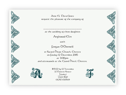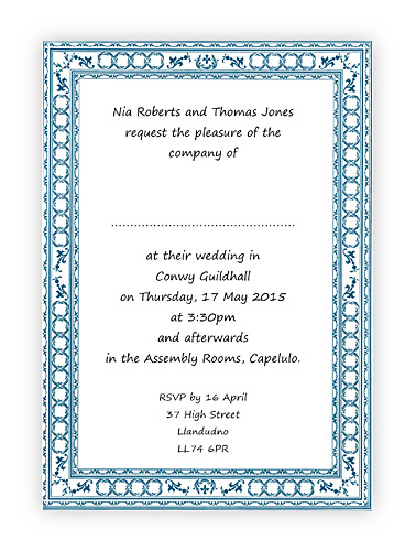 Introducing our new Influences Collection. Invitations are produced with a single card 12.5cm x 17.5cm. You may choose Welsh, English or bilingual – which is achieved by printing on both sides of the card. Inspirations for the designs include Art Nouveau, the Arts and Crafts movement, Chinese textile designs and Celtic knotwork. The simplicity of the cards is reflected in the price range, which you will find to be very reasonable.